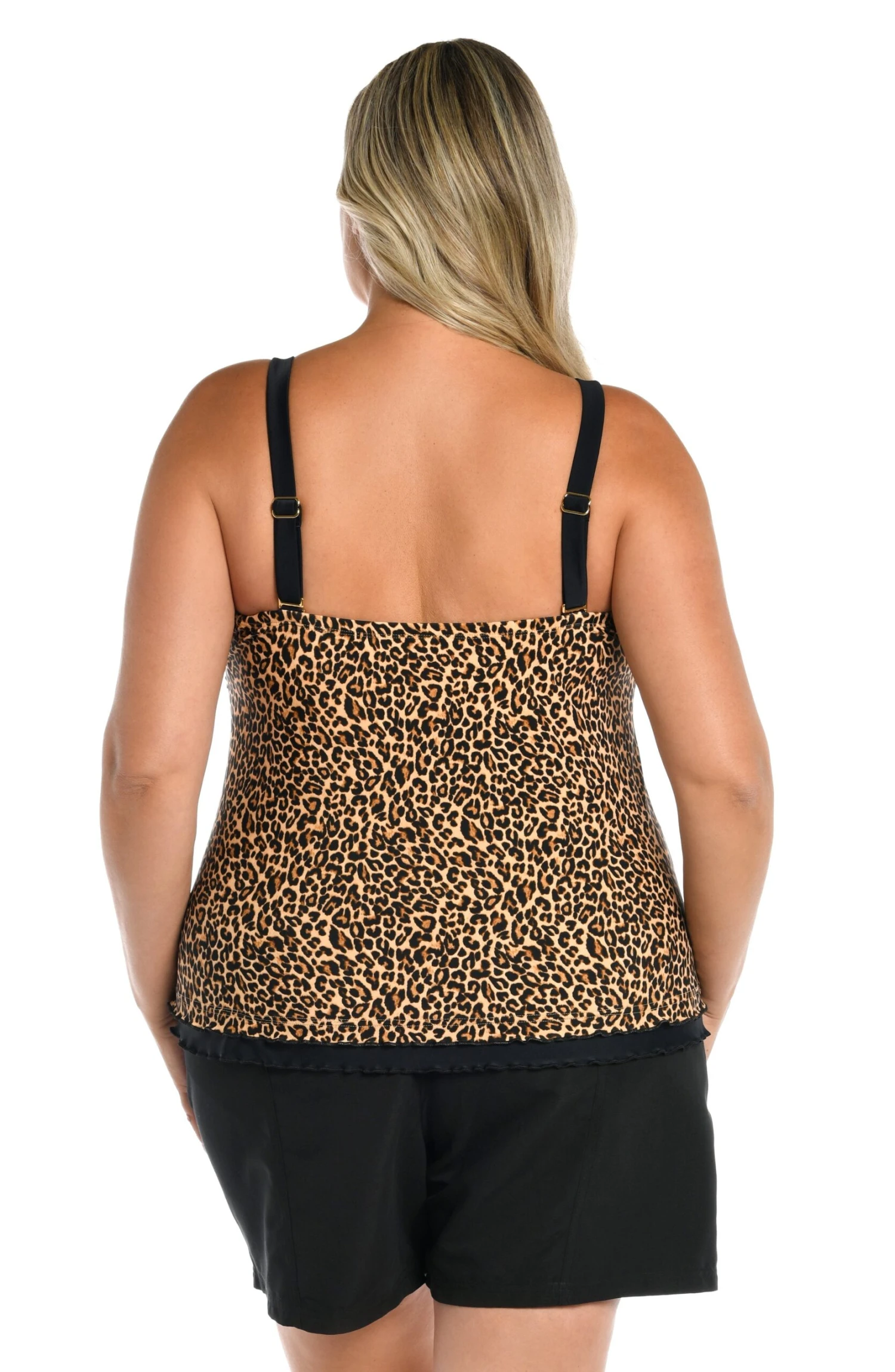 Take a walk on the wild side with this plus-size bandeau tankini in a forever chic animal print. Built-in cups offer comfortable support with or without the adjustable removable straps. The ruffled hem adds a feminine flourish.