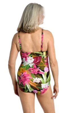 Tropical flowers bloom against a sky of indigo blue on this plus-size swim top, bringing to mind a moonlight stroll along a sandy beach somewhere in paradise. The loose-fitting blouson style masks the tummy area, while the side-tie detail adds a flirty touch. Built-in cups and over-the-shoulder straps lift and support the bustline.