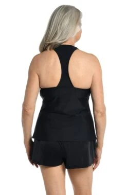 This tankini features gorgeous swirls of blue with pops of white set against a black ground. Built-in cups and adjustable straps provide comfortable lift and support. A feminine flutter hem allows you to show off your softer side for a confident fit.