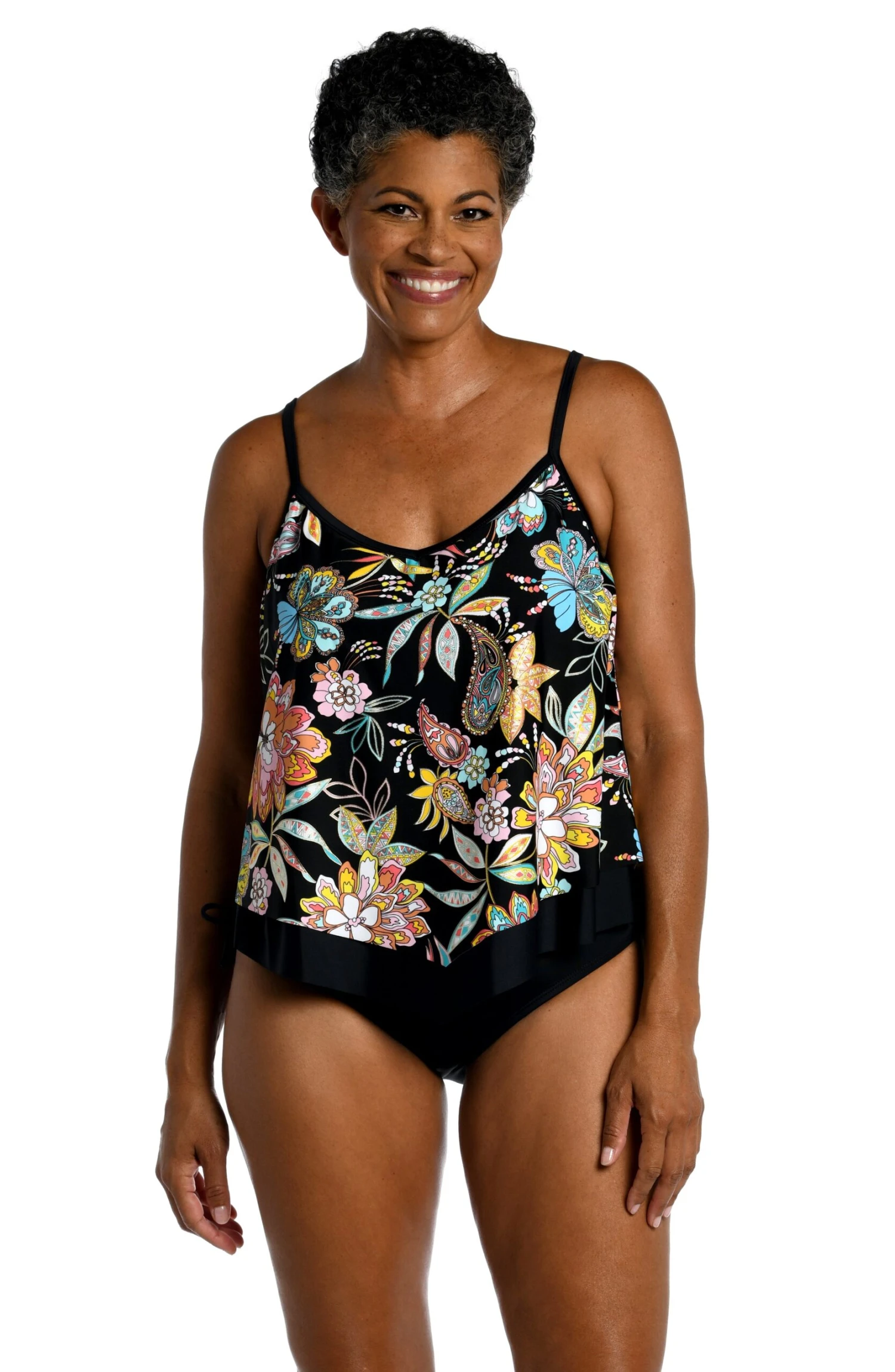 Inspired by the vibrant colors of a coastal town on the Yucatan Peninsula, this tankini features gorgeous blooms in bright, bold hues. Built-in cups and adjustable straps provide comfortable lift and support. A feminine flutter hem allows you to show off your softer side for a confident fit.